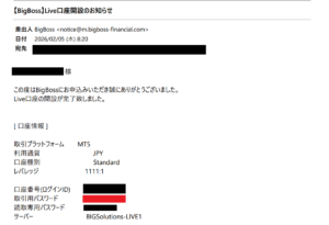 次に登録したメールアドレスに「【BigBoss】Live口座開設のお知らせ」が届きます。