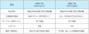口座残高が「0」の状態で90日間放置されるか、重大な規約違反をした場合に「凍結」となります。