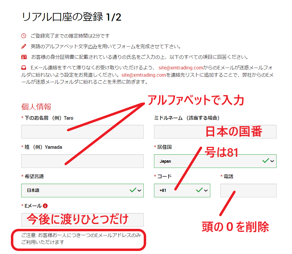 EメールはXMTrading(エックスエム)に登録する個人ひとりにつき1メールアドレスのみが登録可能で、複数のアドレスを登録することはできません。特段、それに支障はないとは思いますが、普段から頻繁に利用しているEメールアドレスを登録しましょう。