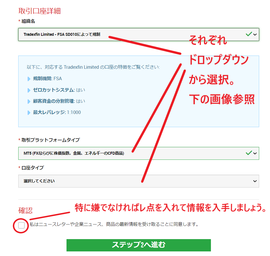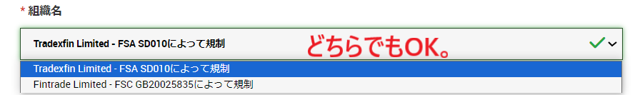 「組織名」はどちらでも影響はないので、私はデフォルトの「Tradexfin Limited-FSA SD010によって規制」を選択して登録しています。