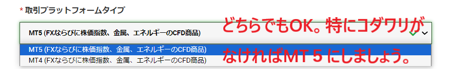 「取引プラットフォーム」ですが、これから初めてFXにチャレンジする方はMT5を選択して問題ないでしょう。私はMT4を利用しているのですが、MT5への移行を考えています。MT4とMT5の違いなどの詳しい情報については、別の記事で詳述します。ちなみに、取引プラットフォームというのは、実際にトレードをするために使うツール(アプリ)のことで、非常に高度な機能を有するのでプラットフォームなんて言い方をするのでしょう。