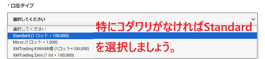 「口座タイプ」も特にコダワリが無い、もしくは初心者の方は「Standard(1ロット=100,000)」を選択しましょう。Standardタイプでも小額元金で取引は可能なのでご安心ください。