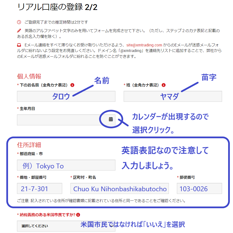 XMTrading(エックスエム)は海外の事業者です。氏名は例にある通り、アルファベットで入力しましょう。