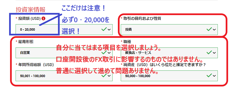 20,000ドル超を選択してしまうと、レバレッジの制限を受けてしまうので、1000倍の取引ができなくなってしまいます。FX初心者の方は、年間投資額は20,000ドルを超えることはあまりないでしょうから、ここは「0‐20,000」を選択しておきましょう。