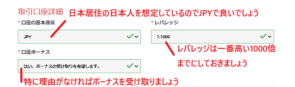 「レバレッジ」に関しては、最も高いレバレッジである「1:1000」を選択しましょう。レバレッジの意味については別の記事で詳述しますが、ひとまず最初の登録時には、最も高いレバレッジが利用できるようにしておきましょう。登録レバレッジよりも低いレバレッジでトレードをする分には問題はありませんので。