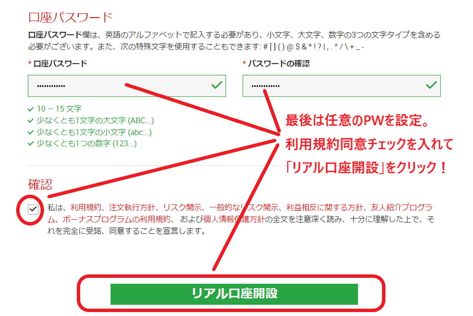 最後に利用規約などの重要事項説明を読んで、□にレ点を入れて「リアル口座開設」ボタンをクリック。