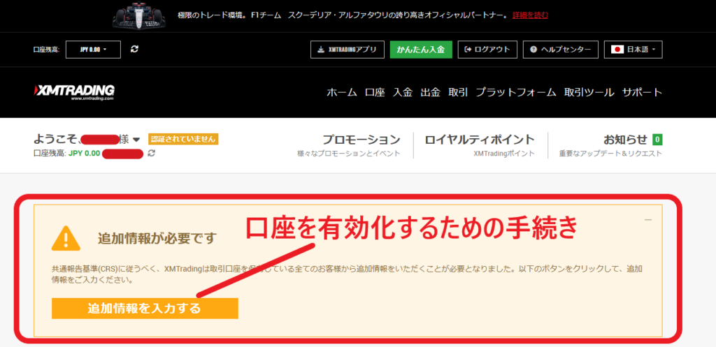 ここでは、まず「口座の有効化」をするための必須手続きである追加情報の提出作業をします。