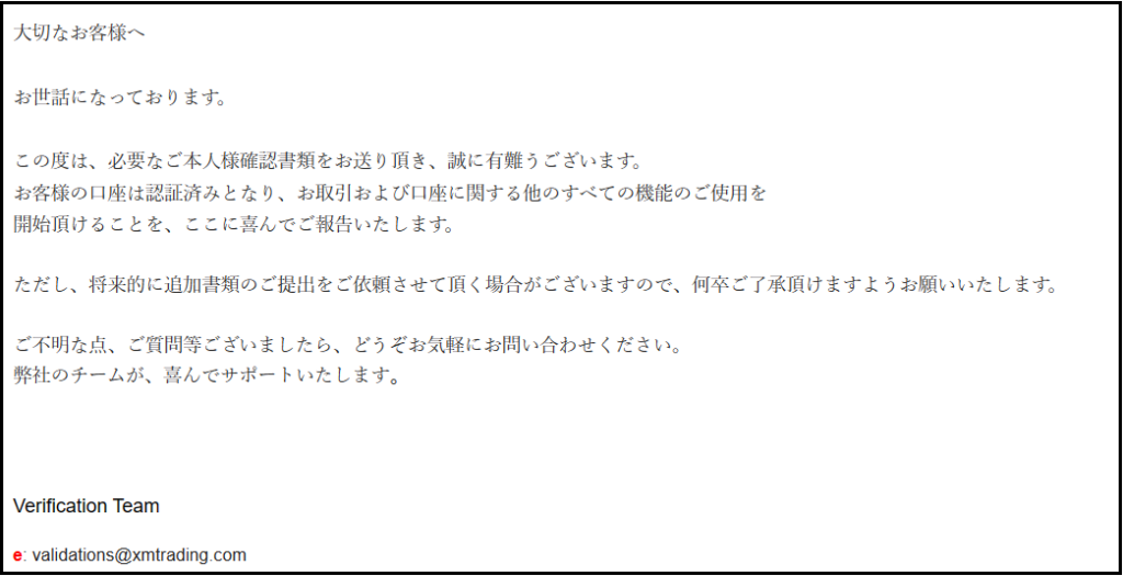 さていよいよ、すべての手順が完了して無事に口座が認証されれば、↓画像のようなメールが届きます。これにてSTEP3の有効化が完了し、リアル取引をする準備がすべて整います。