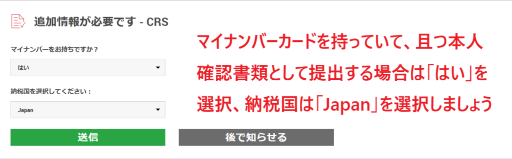マイナンバーカードを既に作成していて、且つ今回本人確認書類としてXMに提出する場合は「はい」を選択して納税国は「Japan」を選択しましょう。マイナンバーカード見本↓↓(写真付き身分証明書として使用できるということです)