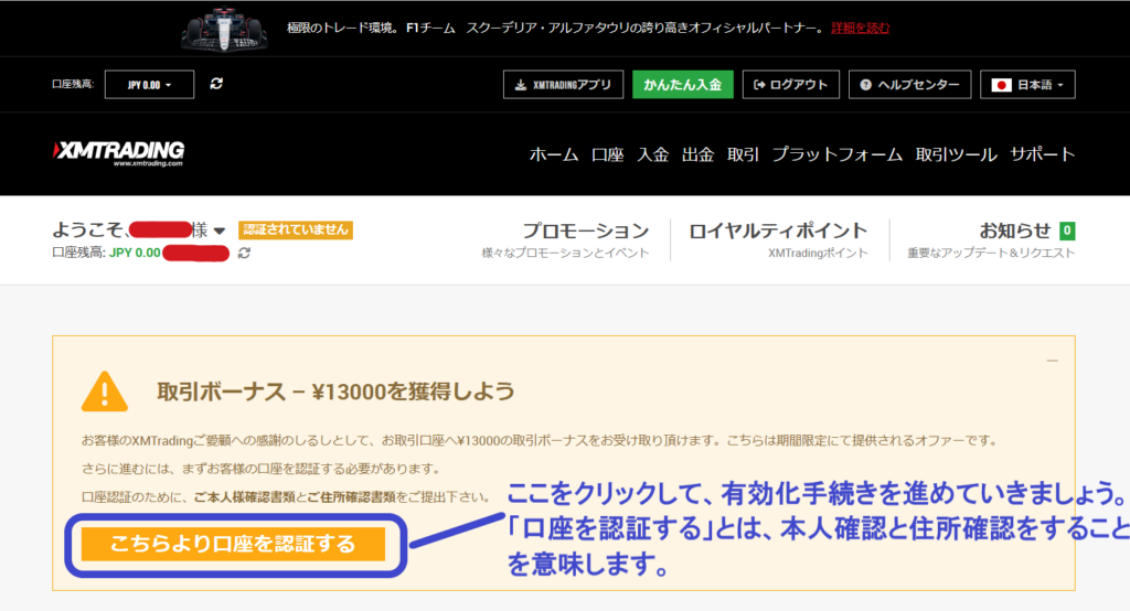 - 口座を有効化(本人確認の認証)するまでは、一切の取引ができない。