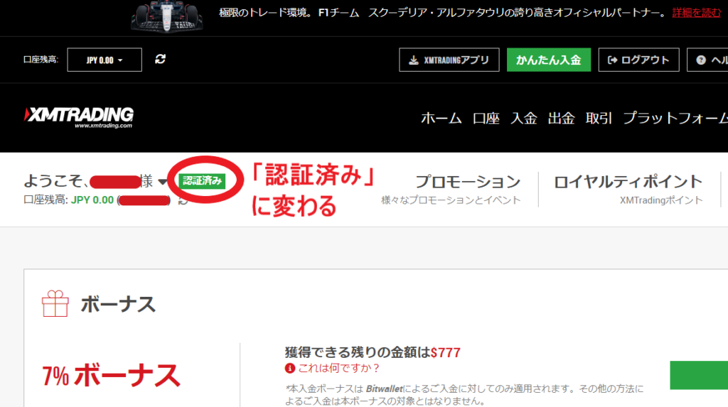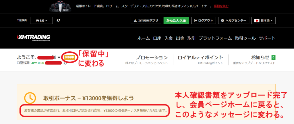 ここまでのSTEPを完了すると、画像のように口座のステータスが「保留中」に変わります。この後、無事に口座認証が完了すると、受け取りを希望していたボーナスも獲得できます。