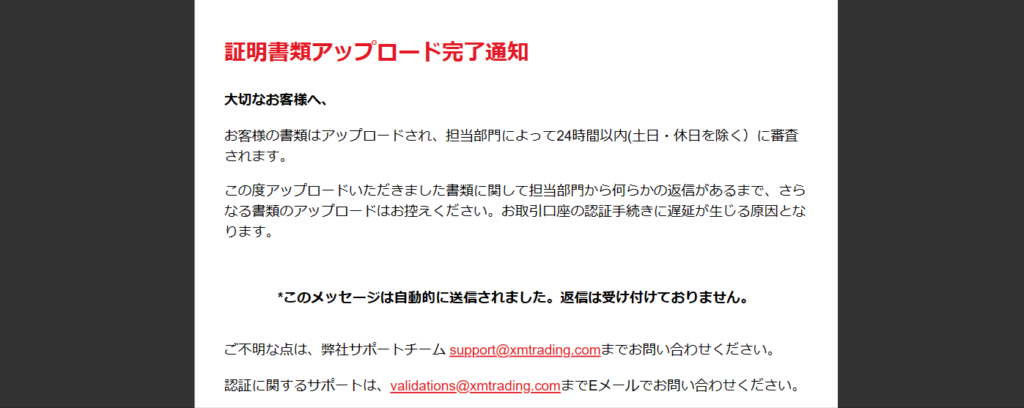 それでは、2種類の書類をアップロードできたら、緑色の「書類をアップロードする」ボタンをクリック。すると間もなく、登録メールアドレスに↓のようにメールが届きます。