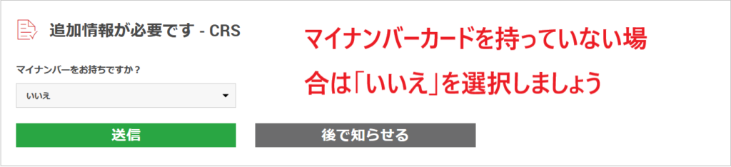 私もまさにそうですが、マイナンバー通知書は持っています(つまりマイナンバー自体は附番されている)が、マイナンバーカードは作っていません。なのでマイナンバーカードを私と同じように未作成の方は「いいえ」を選択しましょう。