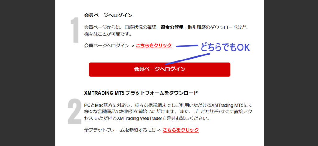 登録したEメールアドレスに、XMから確認メールが届く。メール本文にある「Eメールアドレスを確認する」をクリックして、一旦口座登録が完了。直後に届くメール本文から会員ページにログインする。
